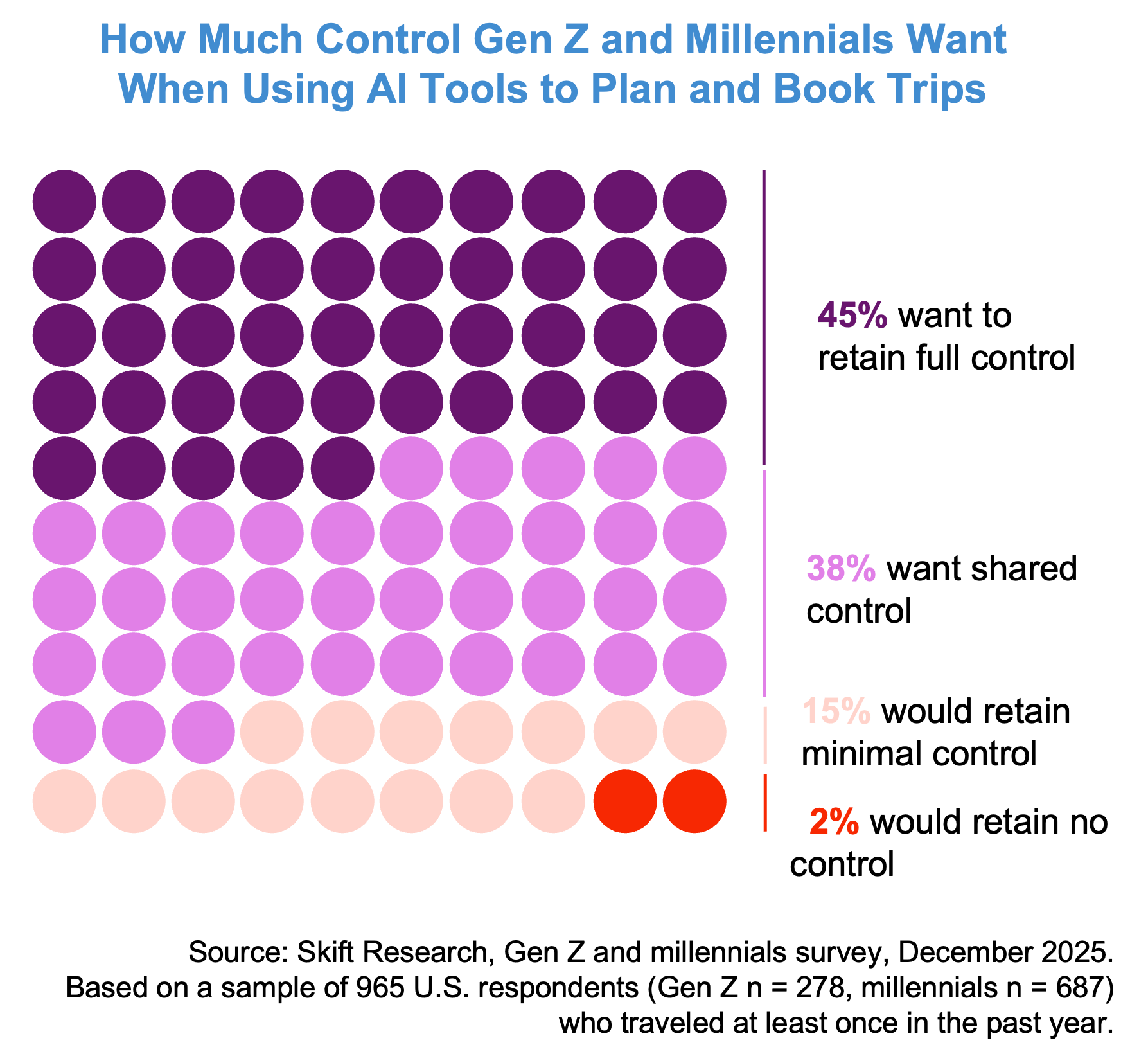 AI has joined social media as a key source of inspiration for young travelers. But most of them are hesitant to cede complete control to a non-human.