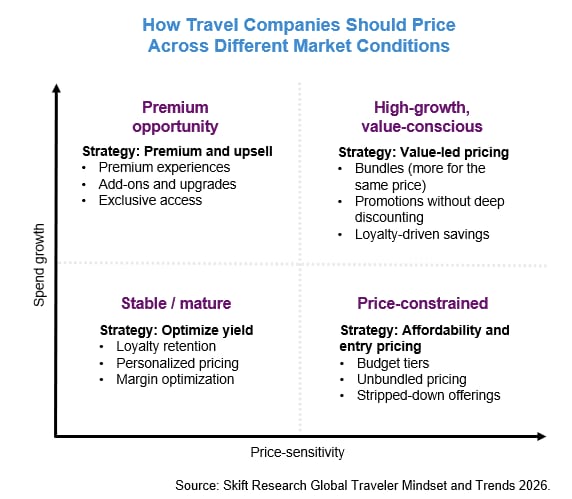 Travel demand remains resilient, but spending behavior is becoming far more selective. Faced with rising costs, travelers are protecting their trips by cutting back first on discretionary spending such as luxury goods and dining, rather than reducing travel altogether. That makes pricing strategy more dependent on the interaction between demand strength and price sensitivity.