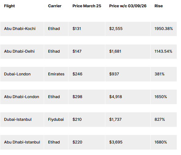 But you don't need a private jet to feel it. Regular passengers — families, business travelers, people just trying to get home — are getting hit with fares that would make a first-class cabin blush. Skift's own analysis found airlines charging up to 20 times normal prices on routes out of the UAE. An Etihad flight from Abu Dhabi to Kochi that cost $131 last March – $2,555 this week. Abu Dhabi to London on Etihad went from $298 to nearly $5,000. Dubai to Istanbul on Flydubai: $210 to $1,737.